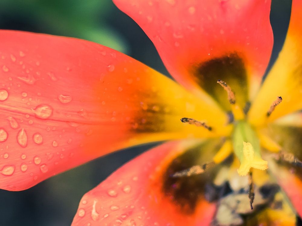 die tröpfchen auf dem blütenblatt sind etwas hervorgehoben. gerade nach dem regen bleiben die tröpfchen schön. viele schöne farben in diesem bild. schön zum aufhängen im garten.