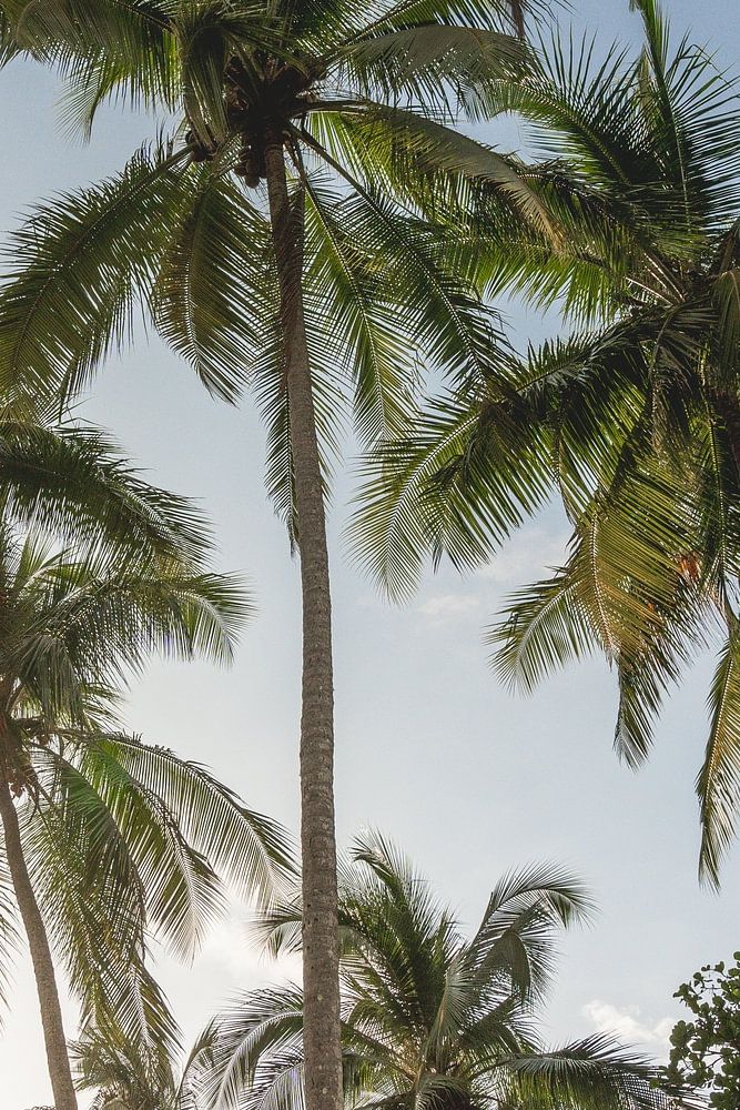 Dieses Foto fängt die Schönheit der schlanken, hohen Palmen ein, die sich in den klaren blauen Himmel recken. Das warme Sonnenlicht, das durch die Blätter scheint, schafft eine sommerliche, tropische Atmosphäre, perfekt für alle, die sich nach Sonne, Meer und Entspannung sehnen. Die üppig grünen Palmen bilden einen schönen Kontrast zum Himmel und vermitteln ein Gefühl von Freiheit und exotischer Ruhe. Ideal für Liebhaber tropischer Landschaften und sommerlicher Stimmungen.