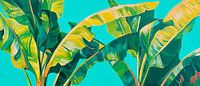 Lebendige Tropenflair entfaltet sich in dieser farbenfrohen Komposition, wo üppige Blattstrukturen in zarten Grüntönen mit einem strahlend blauen Hintergrund harmonieren. Die üppige Darstellung der Pflanzen bringt eine erfrischende, entspannende Atmosphäre mit sich und eignet sich hervorragend für das Wohnzimmer oder die Küche, um einen…