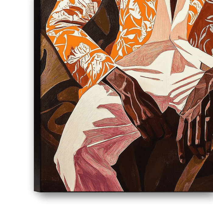 Stel je voor: een weelderige jungle, waar de lucht warm en vochtig aanvoelt, gevuld met de geur van aarde en groen. In het hart van deze natuurlijke oase zit een afro-Amerikaanse man, die perfect opgaat in de levendige omgeving. Zijn oranje jasje met een subtiel bladmotief is een speelse knipoog naar de flora om hem heen, terwijl het de levendigheid van de jungle accentueert. De felle kleur van zijn jasje staat in mooi contrast met de rijke bruintinten van de achtergrond en de donkergroene bladeren die als een levendig tapijt om hem heen liggen.