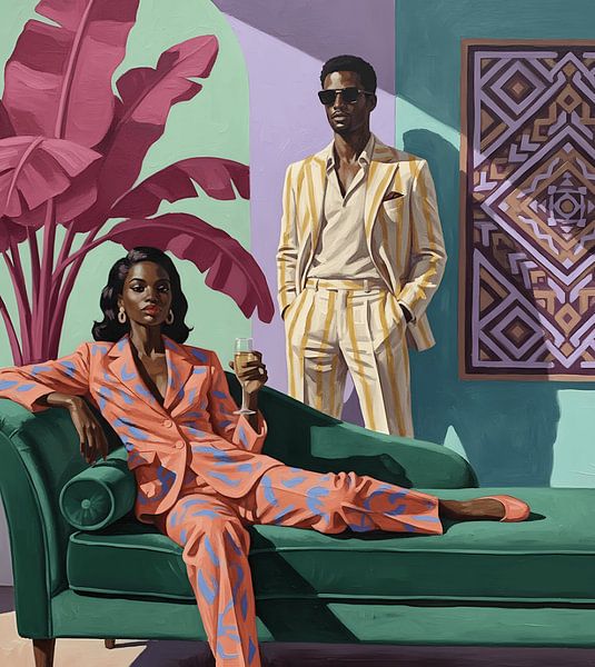 Diese lebendige Komposition schafft eine Atmosphäre, die gleichzeitig entspannt und raffiniert ist, als ob sich die Szene auf einer luxuriösen Suiten-Terrasse irgendwo in einem warmen, modernen Resort abspielen würde. Die Frau liegt lässig auf einer tiefgrünen Chaiselongue, gekleidet in einen deutlich korallenfarbenen Anzug mit…