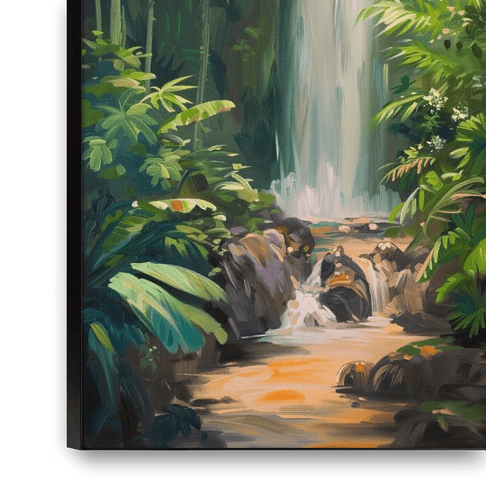 Tropical Waterfall Oasis" zeigt eine üppige Flucht in ein verstecktes Paradies, wo ein Wasserfall kraftvoll und doch ruhig in einen kristallklaren Pool stürzt. Umgeben von sattgrünen Blättern und gefiltertem Sonnenlicht, das durch die Baumkronen bricht, ist dieses Bild eine Einladung, in die ruhige Schönheit der Natur einzutauchen. Das…