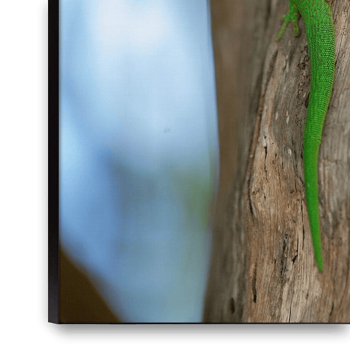 Bestelle das Foto Tropische grüne Neon-Eidechse auf den Seychellen von t.ART als Reproduktion auf Leinwand, Alu-Dibond, als Poster, Fototapete oder Acrylglasbild.