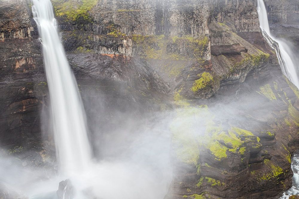 Dieses Werk zeigt die beeindruckende Reihe von Wasserfällen Haifoss. Das Wasser fällt hier im Süden Islands in eine tiefe Schlucht mit steilen Wänden. Die Umgebung ist eine trostlose Gegend mit vulkanischen Lavafeldern und wenig, was auf menschliche Anwesenheit hindeutet. Ich habe das Foto bei bedecktem Himmel und starkem Wind aufgenommen. Schlechtes Wetter also, aber das passt zur Atmosphäre dieses rauen Stücks Natur. Auf dem Foto ist deutlich zu sehen, wie das Wasser der Wasserfälle vom stürmischen Wind weggeblasen wird. Die Schlucht selbst ist von beeindruckender Unzugänglichkeit und, typisch für Island, mit leuchtend grünem Moos bewachsen.