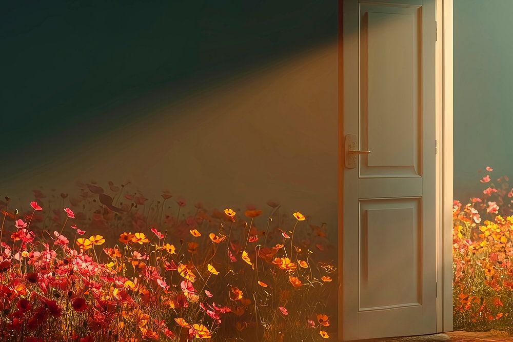 Ein surreales Kunstwerk mit einer offenen Tür, die zu einem lebendigen Garten führt. Um die Tür herum befindet sich ein üppiges Beet mit bunten Blumen, das ein Gefühl von Leben und Wärme vermittelt. Der Hintergrund hat einen dunklen Raum, der mit der Helligkeit des Gartens kontrastiert und ein Gefühl des Staunens hervorruft. Weiches, diffuses Licht beleuchtet die Blumen und hebt ihre Texturen hervor. Die Komposition wirkt geheimnisvoll und lädt zur Erkundung ein.