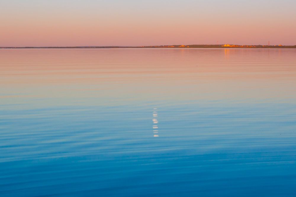 Türkisblauer Himmel und türkisblaues Wasser, die Sonne geht auf, Pleshcheyevo-See. glatte blaue und türkisblaue Seeoberfläche in der Morgendämmerung, rot und orange und himmelblau.