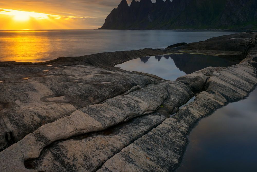 Tugeneset rocky coast with mountains in background at sunset, Senja, Norway