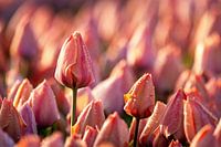 Rosa Tulpe bei Sonnenaufgang mit Tautropfen.