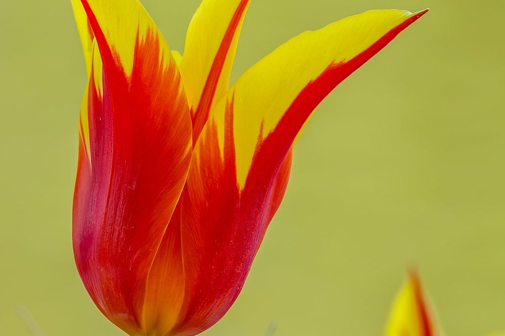 Auffallend bunte Tulpe in Rot und Gelb. Sie hebt sich gut von den umliegenden Tulpen ab und bildet ein buntes Ganzes.