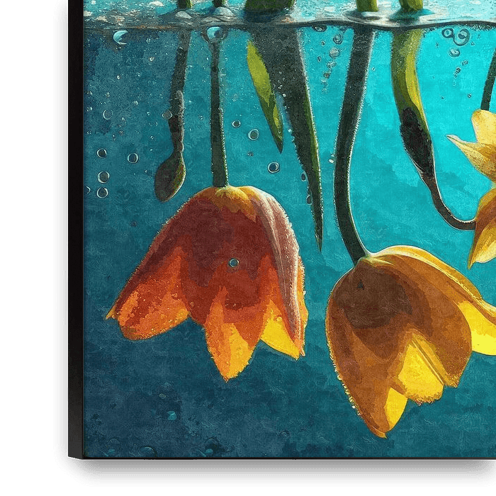 Dieses Werk zeigt die klassische Schönheit von Tulpen und Narzissen, die sich über einer spiegelnden Wasseroberfläche erheben. Die Blüten in Rot, Gelb und Weiß strahlen vor einem leuchtenden türkisblauen Hintergrund, der ihre Farben intensiviert. Tropfen und Reflexionen verleihen dem texturiertem Motiv Dynamik und Tiefe, während die…