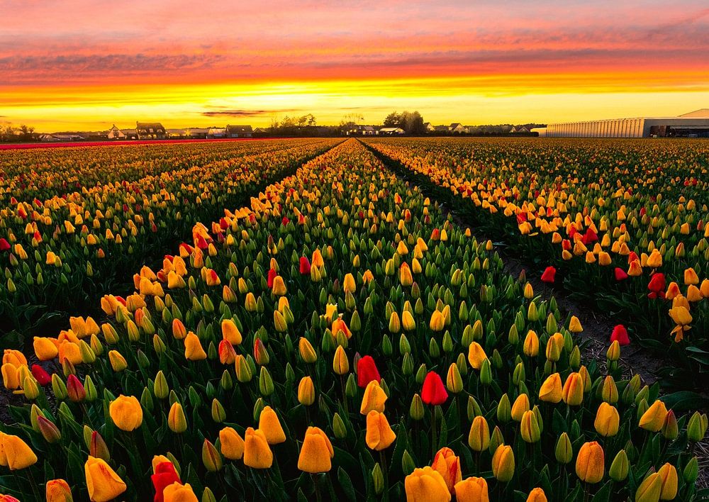 Ein wunderschöner Sonnenuntergang über einem gemischten Tulpenfeld, was will man mehr? Wunderbarer Frühling!