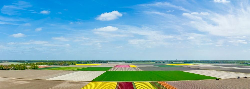 Tulpen auf landwirtschaftlichen Feldern im Noordoostpolder in Flevoland, Niederlande, während des Frühlings von oben gesehen. Der Noordoostpolder ist ein Polder in der ehemaligen Zuiderzee, der ursprünglich angelegt wurde, um mehr Land für die Landwirtschaft zu schaffen. Ein breites Panoramabild, das die verschiedenen Farben der landwirtschaftlichen Felder zeigt.