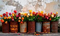 Bunte Tulpensträuße, in sieben rostigen Fässern. Die Fässer stehen draußen vor einer alten, baufälligen Mauer; die Tulpen sehen nicht mehr ganz frisch aus und werden bald verwelken. Das Bild wurde mit ai erstellt.