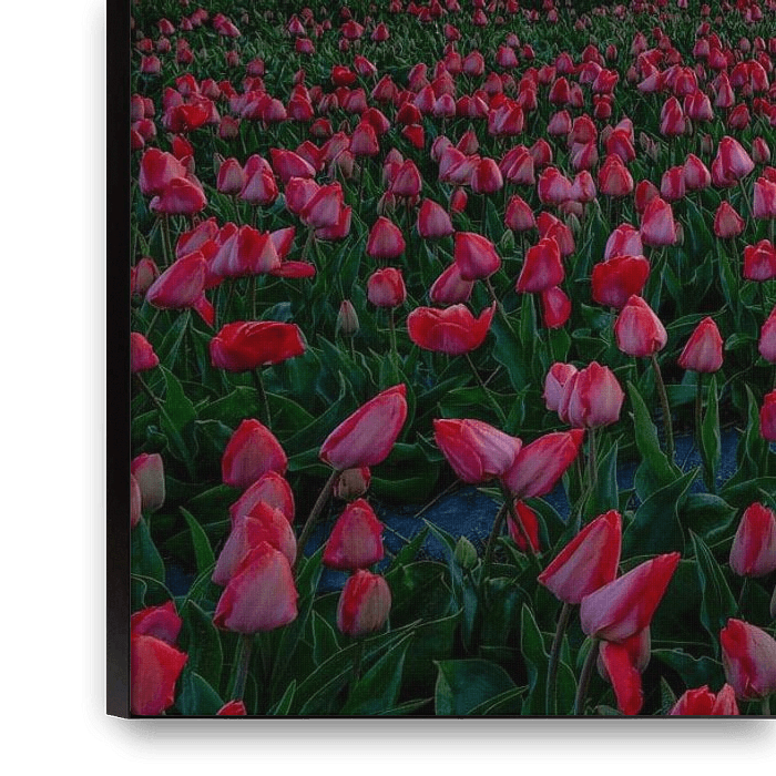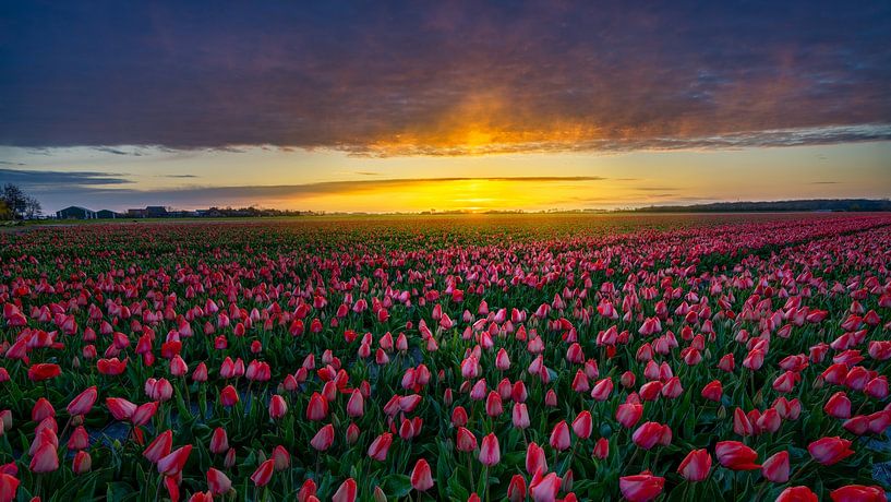 Ein riesiges Tulpenfeld mit der aufgehenden Sonne im Hintergrund, die langsam die Wolken darunter beleuchtet. Der Tag beginnt mit einem warmen Schein über dem roten Tulpenfeld.