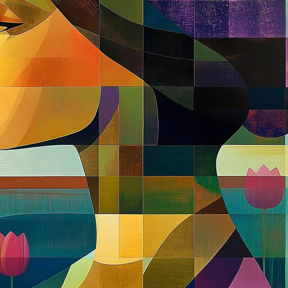 Mit AI und Photoshop mit verschiedenen Filtern abstraktes Bild der Frau mit Tulpen, in ein buntes Ganzes erstellt.