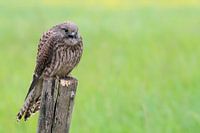Dieses Foto zeigt einen Turmfalken (Weibchen), der auf einer Stange sitzt. Der schöne weiche Hintergrund bringt diesen Raubvogel wunderbar zur Geltung.