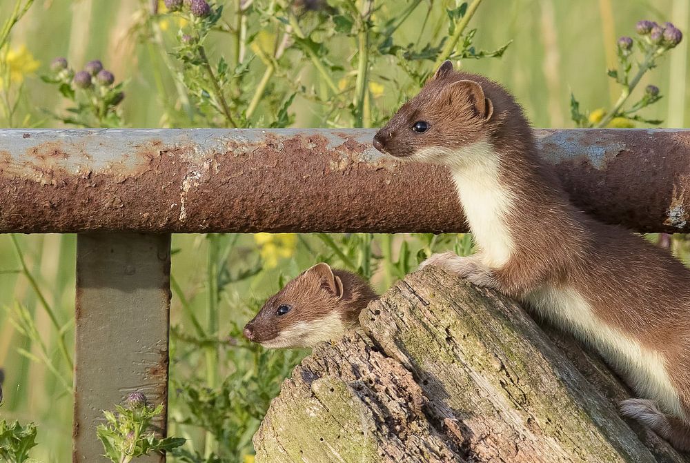 2 kleine roofdieren de hermelijn zittend op de uitkijk lekker in het zonnetje .de bloemen op de achtergrond geven deze foto nog veel meer kleur.