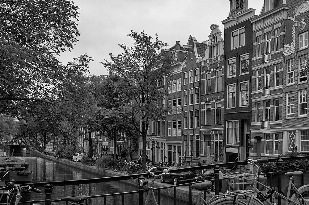 Am Brückengeländer geparkte Fahrräder, Grachtenhäuser und der Westerkerkoren in einem Bild, so typisch Amsterdam!