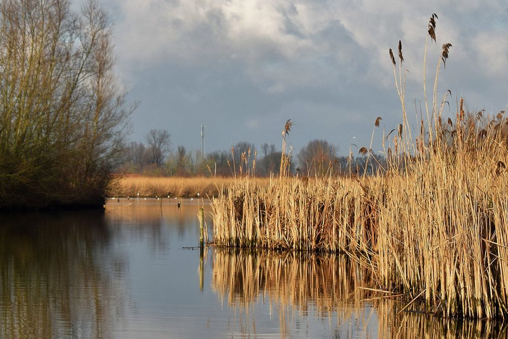 Malerische holländische Landschaft mit Schilf, Wolken und Bäumen.