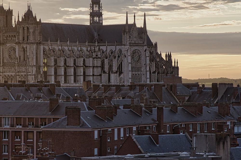 Über den dichten Ziegeldächern einer europäischen Stadt erhebt sich monumental eine gotische Kathedrale: Kathedrale Notre-Dame d’Amiens. Ihr filigraner Turm und die reich gegliederten Fassaden ragen in einen Himmel aus warmem Morgenlicht und ziehenden Wolken. Die Dächer und Schornsteine im Vordergrund wirken ruhig und alltäglich,…