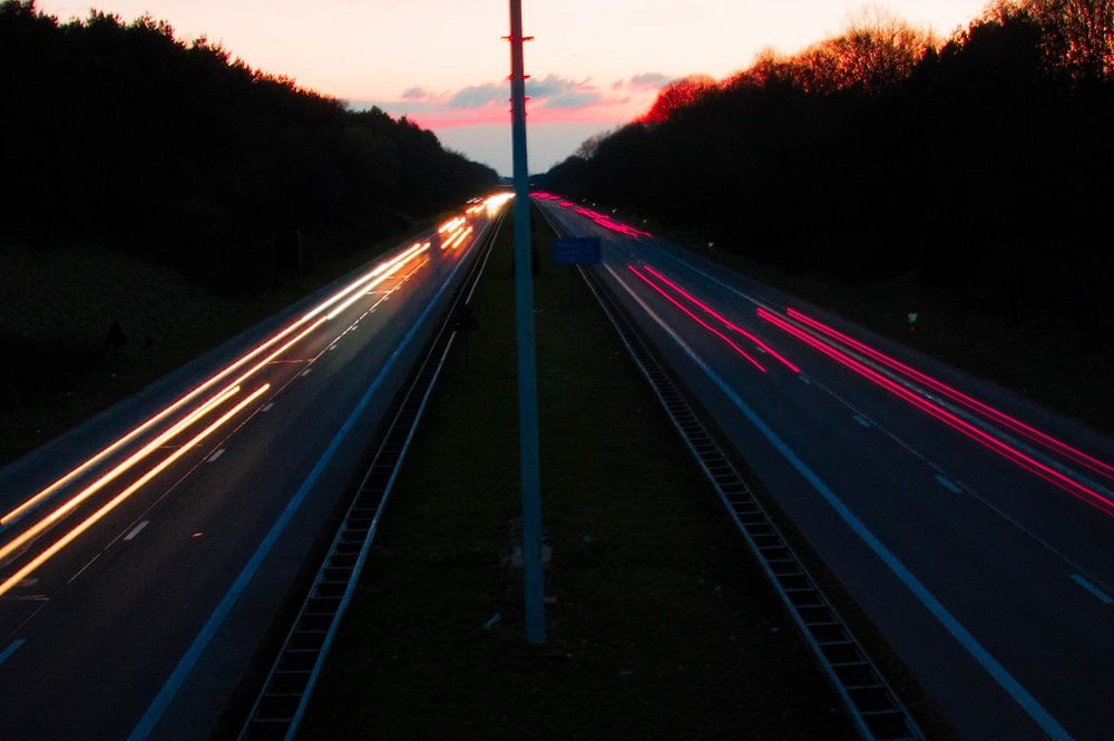 Sonnenuntergang am Abend, der Verkehr rauscht nach Hause