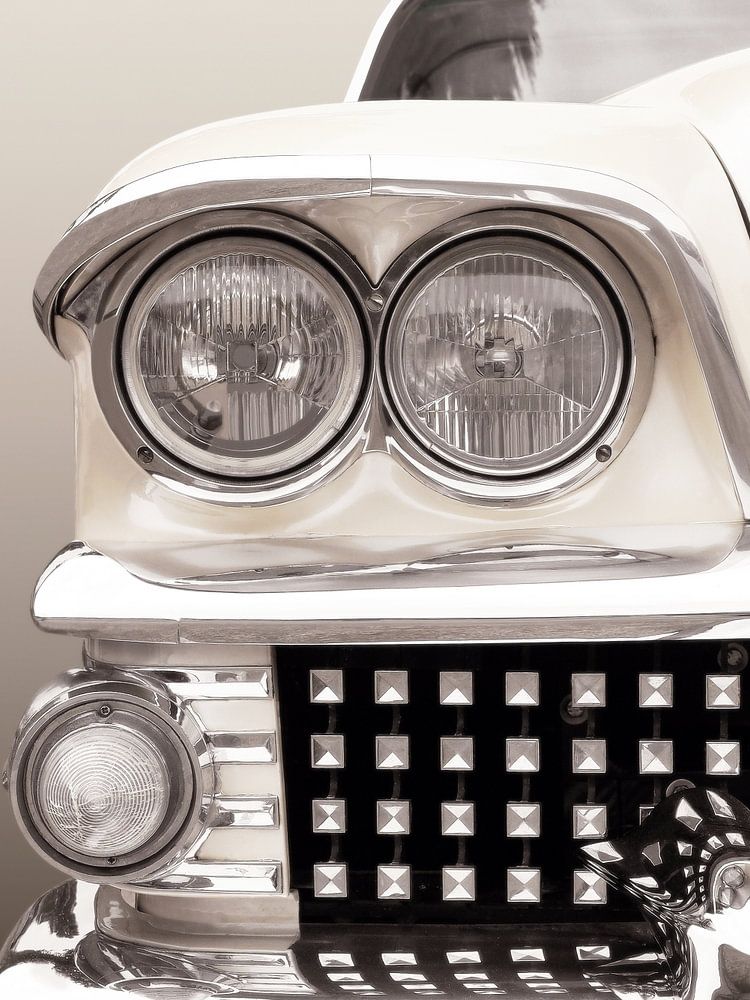 Das Bild zeigt Ihnen die Front eines amerikanischen Oldtimers aus dem Jahr 1958. Der Fokus liegt auf einigen Details eines spektakulären Automobils dieser Zeit.