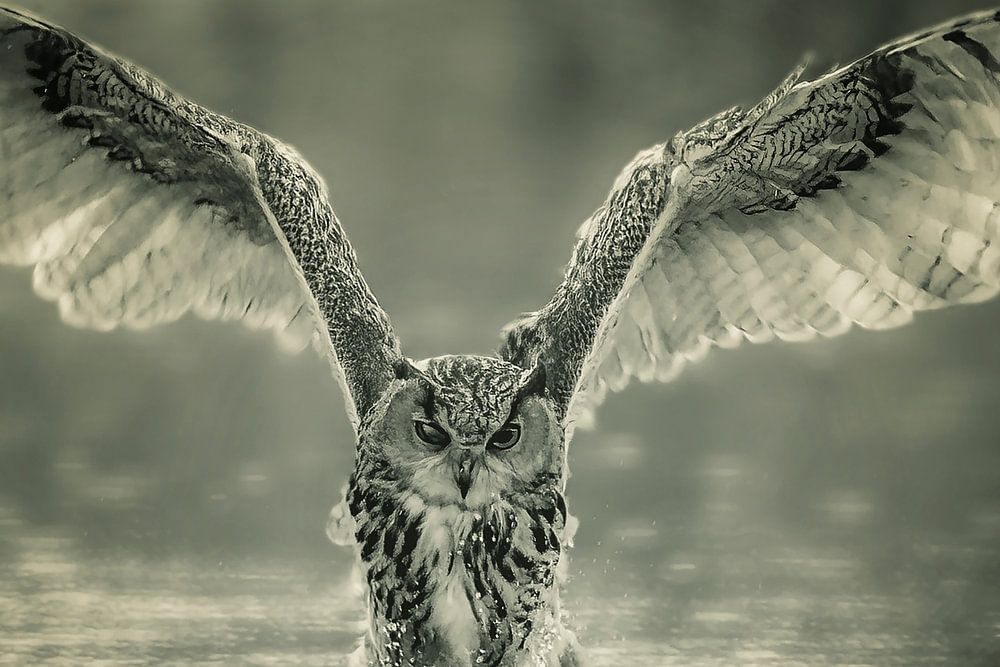Dieser Uhu hebt ein Stück Fleisch aus dem Wasser auf.