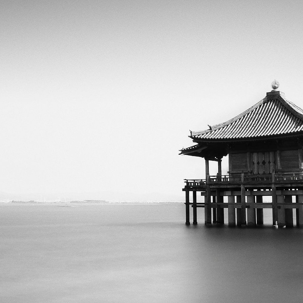 Schwimmendes Gebäude der Ukimido-Halle im Mangetsu-ji-Tempel, Schwarz-Weiß-Langzeitbelichtung. Stadt Otsu, Präfektur Shiga, Japan. Jahr 2010.