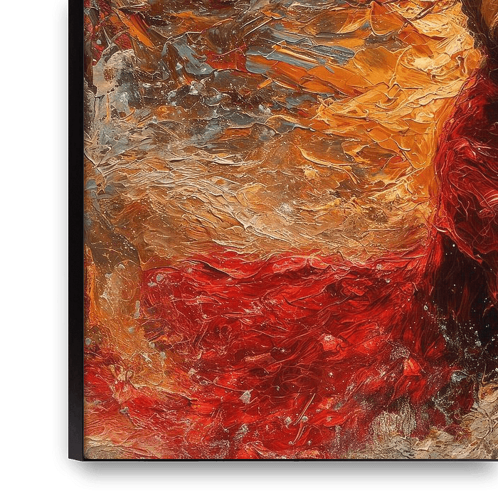 Dieses Gemälde zeigt ein Paar in einer liebevollen Umarmung, beleuchtet von einem Hintergrund, der von der Wärme ihrer Leidenschaft zu brennen scheint. Die intensiven Farben und fließenden Bewegungen würden einen Raum mit sanfter Beleuchtung und warmer Dekoration vervollständigen.