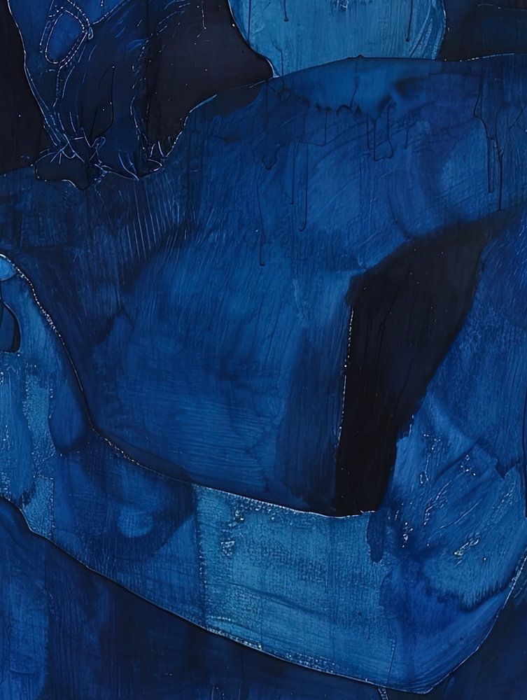 Die Konturen der Figuren sind nur leicht akzentuiert, so dass die Grenzen zwischen ihnen zu verschwimmen scheinen und sie fast miteinander verschmelzen. Der Hintergrund ist dynamisch, mit sowohl tiefdunklen als auch hellen, blauen Bereichen, die einen starken Kontrast erzeugen, der die Figuren hervorhebt. Die verwendete Farbe Indigo ist für ihre Tiefe und Intensität bekannt und trägt zur emotionalen Schwere des Werks bei. Durch den begrenzten Einsatz von Farbe und die Konzentration auf Form und Bewegung wird ein Gefühl von universeller Menschlichkeit und Verbundenheit hervorgerufen. Das Kunstwerk strahlt sowohl Ruhe als auch Leidenschaft aus, wobei die Umarmung eine Quelle des Trostes und der menschlichen Wärme zu sein scheint.
