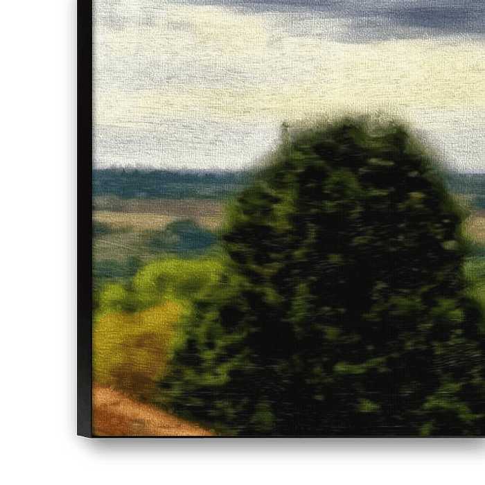 Dieses stark impressionistische, stilisierte Fotokunstbild zeigt einen Abend mit schweren Wolken und Schatten über einer italienischen Landschaft. Reihen von Olivenbäumen führen zu den fernen Bergen und einem Stück klaren Himmels, bevor wir die schweren Wolken darüber sehen.
