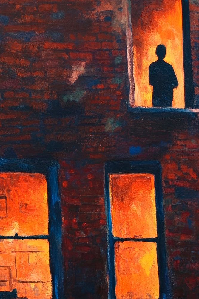 Inmitten der dunklen Abenddämmerung erstrahlen warme Lichtschein in einem geheimnisvollen Gebäude, während eine einsame Silhouette nachdenklich ins Leere blickt. Diese eindringliche Szenerie verleiht jedem Raum eine besondere Tiefe und regt die Fantasie an — ideal für das Wohnzimmer oder einen kreativen Arbeitsbereich, wo Gespräche und Inspiration fließen können.