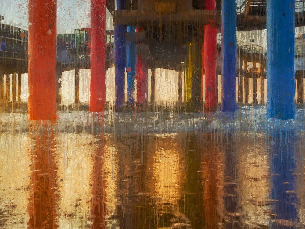 Bestelle diese Malerei Unter dem bemalten Scheveninger Pier von Arjen Roos als Reproduktion auf Leinwand, Alu-Dibond, als Poster, Fototapete oder Acrylglasbild.