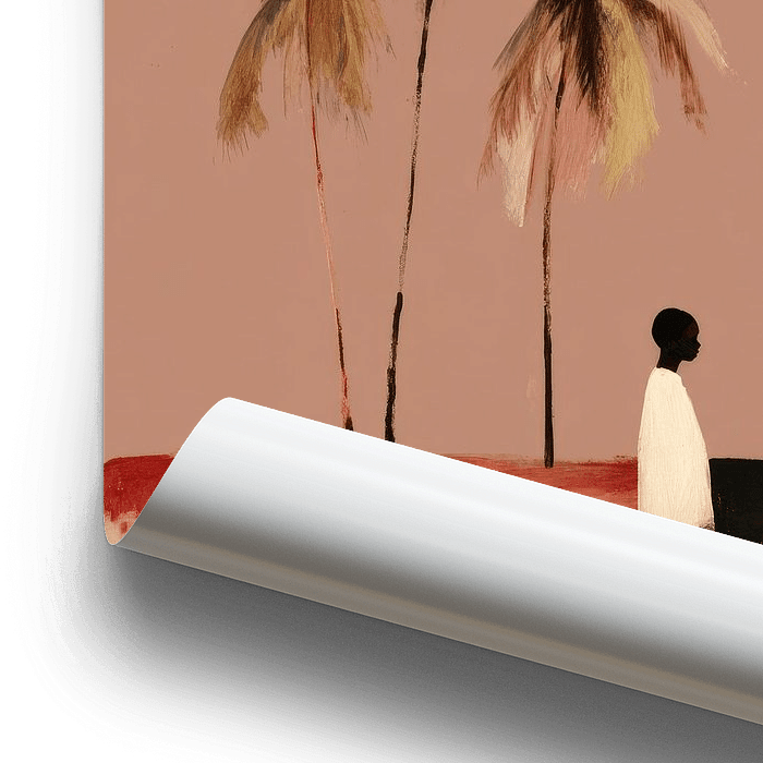 Eine minimalistische tropische Szene mit einer silhouettierten Figur unter hohen, sich wiegenden Palmen. Die warmen Sand- und Rosttöne, kombiniert mit dem zarten Rosa des Himmels, schaffen eine heitere Urlaubsatmosphäre. Ein zeitloses Kunstwerk, das Ruhe und Wärme in jedes Interieur bringt.