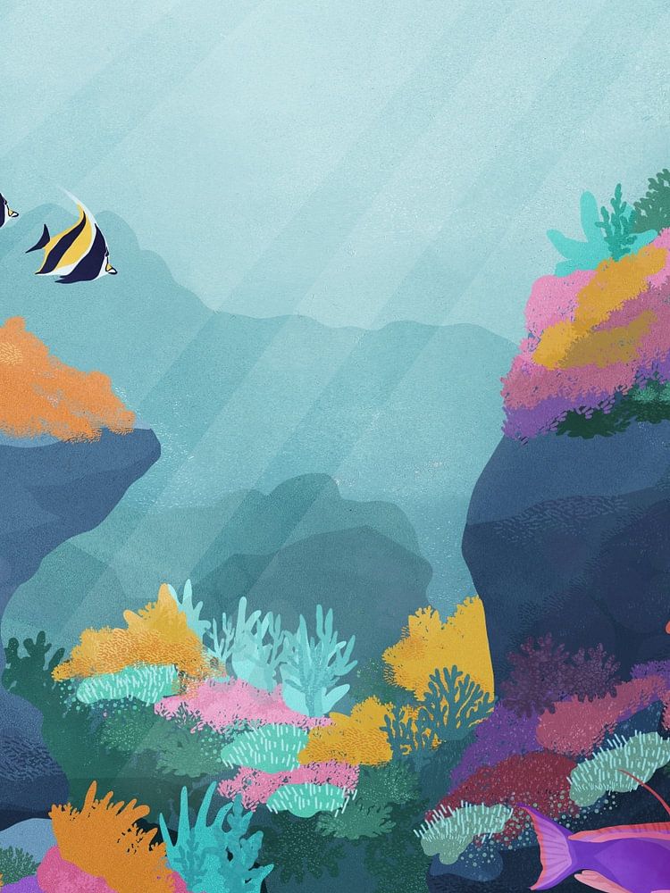Bunte Illustration des Lebens unter Wasser. Korallenriff, Fische, Seepferdchen in den Tiefen des Ozeans.