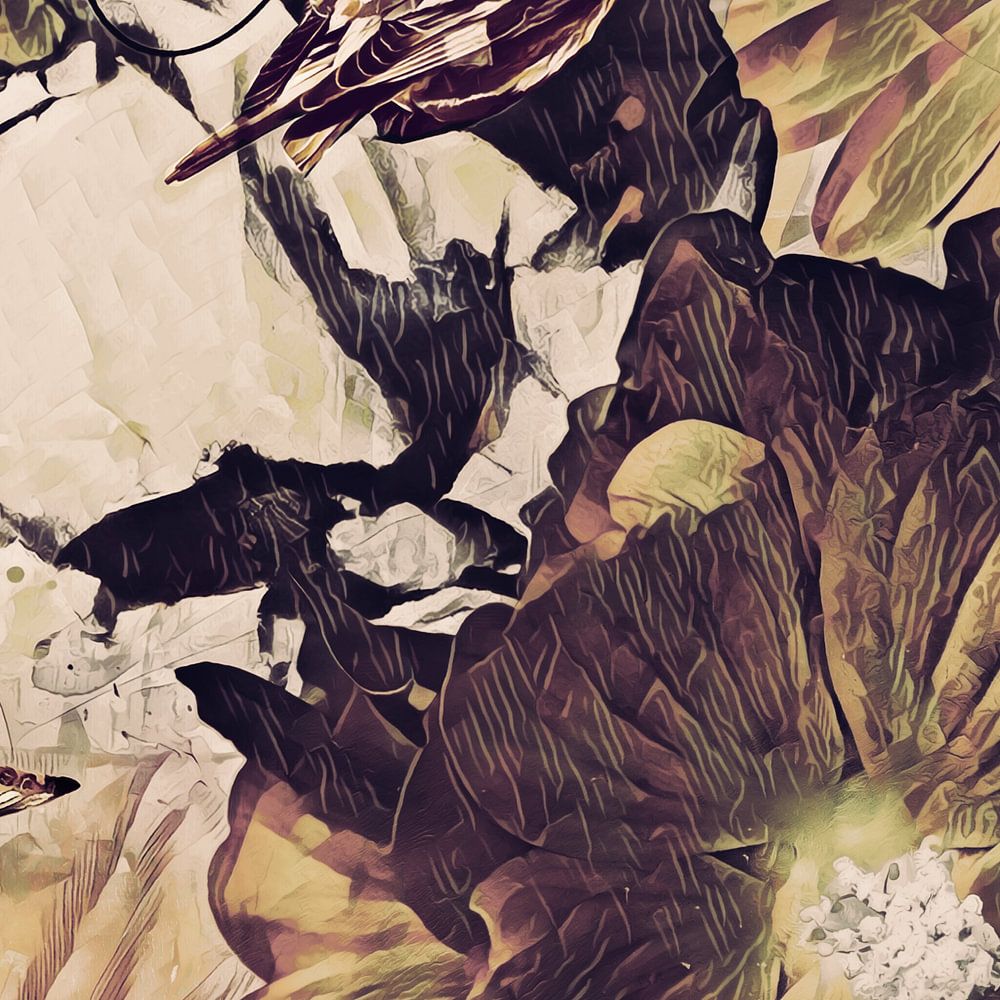 Dieser Mann liegt bequem und sehr entspannt da. Er genießt ganz offensichtlich seinen Platz in diesem Kunstwerk. Warm und gemütlich sieht das aus. Er genießt diesen natürlichen Platz in diesem Kunstwerk, begleitet von einem Vogel und einem Schmetterling. Er scheint einfach dorthin zu gehören. Die Blumen hier stehen natürlich für diese Natur. Ein Stück Natur, das fast jeder von uns in seinem eigenen Garten hat und das wir im Frühling und Sommer am meisten genießen. Auch im Herbst ist dieses kleine Stück Natur zu genießen, vor allem die schönen warmen Farben, die das verfärbte Laub so kurz vor dem Winter zeigt, wenn alles kahl ist und ruht. Aber bis dahin ist unser kleines Stück Natur eine Oase der Ruhe, in der wir den ganzen Sommer über in das üppige Blumenmeer unseres Gartens eintauchen. Die Farben dieses etwas surrealen und meist malerischen Werks sind Gelb, Orange, Braun, Beige und Creme.