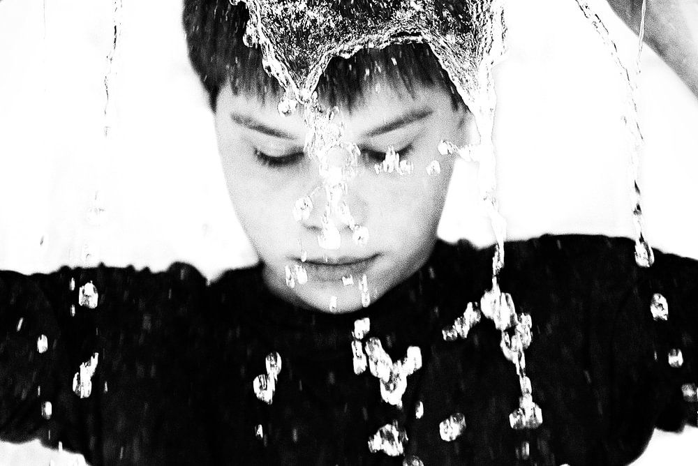 Ein Junge fängt Wassertropfen über seinem Kopf auf und sorgt dafür, dass er nicht nass wird