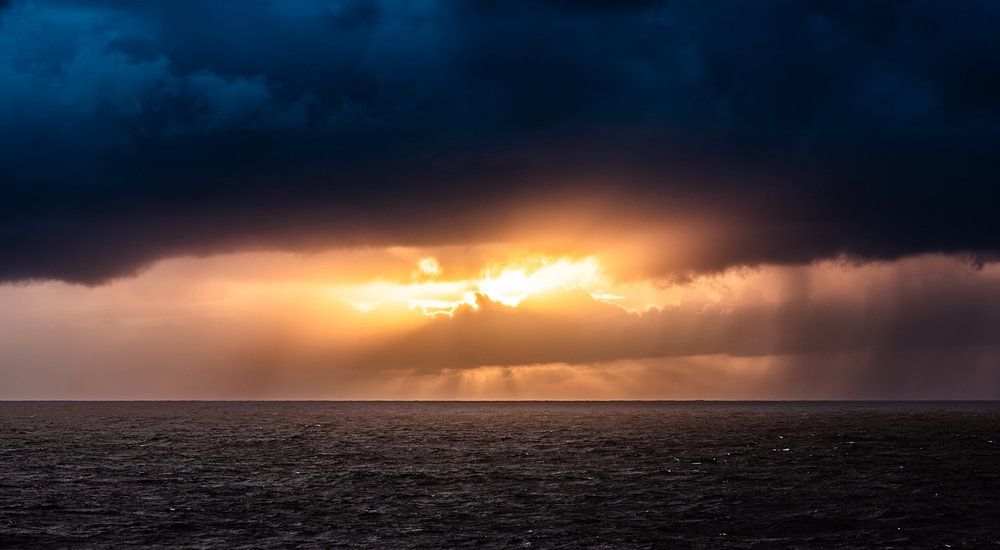 Im Gegensatz zur weitläufigen Meinung, die Abende und Sonennuntergänge während einer Schiffsexpedition (wie zum Beispiel der PS132 von Bremerhaven nach Kapstadt mit der Polarstern), hat jeder sich neigende Tag seine eigenen Facetten. In diesem Fall überdachte eine Regenfront die letzten Sonnenstrahlen, die sich an einem grauen Wolkenband vorbei drängten. In solche einer Konstellation wirkt die Sonne nicht als wäre sie 150 000 000 km von der Erde entfernt und wäre stattdessen ein lokales Wetterphänomen, das die Wolken versuchen zu ersticken.