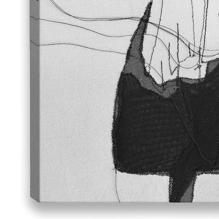 Irrevocable', eine figurative Arbeit aus schwarzem Draht und schwarzem Tüll auf weißer Leinwand. Die Bewegung der losen schwarzen Fäden kontrastiert mit der unwiderlegbaren schwarzen Oberfläche an den Beinen.