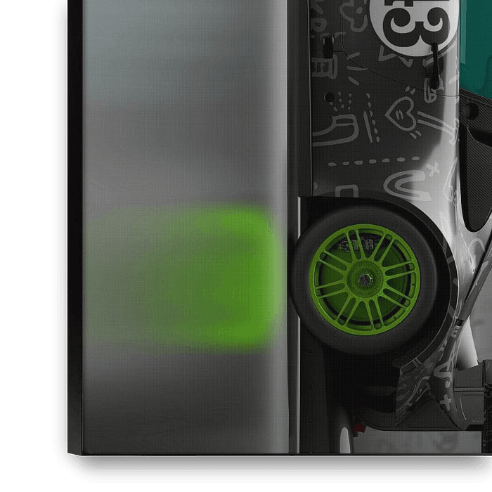 Ein kühner und künstlerischer Rennwagen mit monochromen Graffiti-Kritzeleien und der Nummer 43 sticht mit seinen auffälligen neongrünen Rädern hervor. Das einzigartige Seitenprofil und die vertikale Ausrichtung des Wagens verleihen ihm ein dramatisches Flair, das die Kultur der Straßenkunst mit der Energie des Motorsports verbindet. Vor…