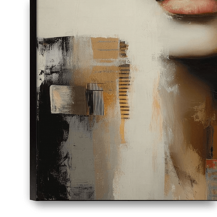 Urban Muse ist ein kraftvolles, modernes Porträt eines Frauengesichts, das aus abstrakten Farbflächen hervorgeht. Ein Auge schaut einen direkt und intensiv an, während der Rest des Gesichts sich teilweise in Farbschichten in Beige, Schwarz, Kamel, Terrakotta und einem Hauch von sanftem Türkis auflöst. Die Kombination aus…