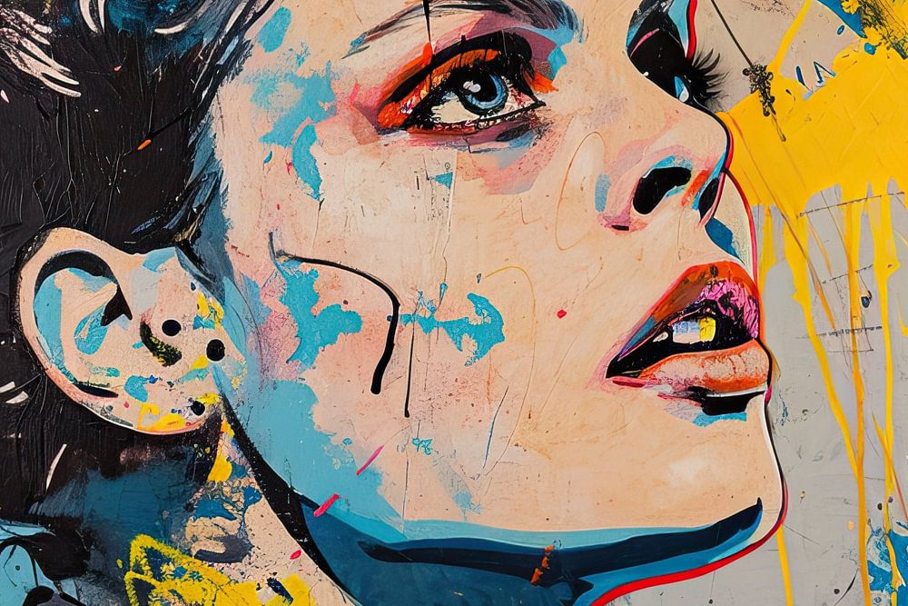 Urbane Art Portrait | Intense Gaze Impermanence - Dieses kraftvolle Werk vereint ein fotorealistisches Porträt mit einem Hintergrund aus explosiven Farbspritzern - eine faszinierende Verschmelzung von Präzision und Chaos. Die weibliche Figur blickt mit intensivem Blick nach oben, während um sie herum Linien und Formen in einer Symphonie aus Gelb, Blau, Rosa und Schwarz tanzen.