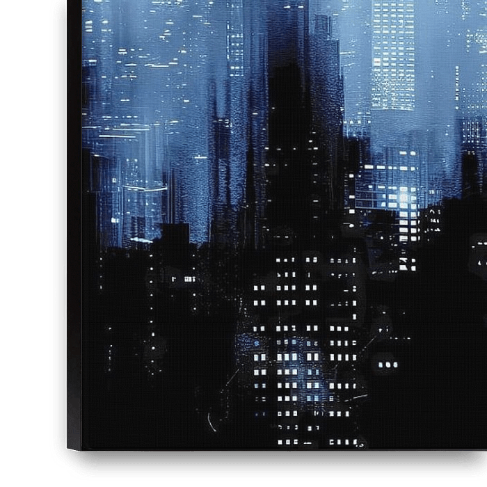 Diese abstrakte digitale Darstellung zeigt die Silhouette eines Paares vor dem Hintergrund der blauen Lichter einer städtischen Skyline. Die klaren Linien und Formen der Silhouetten stehen im Kontrast zu den abstrakten Lichteffekten der Stadtlichter, die eine Atmosphäre von Urbanität und Modernität vermitteln. Die abstrakten Elemente…
