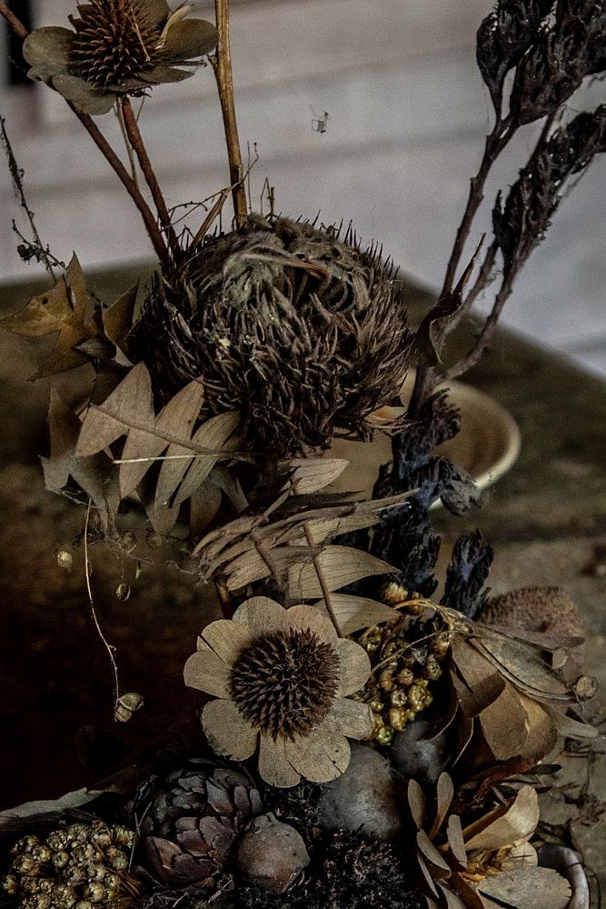 Blumenarrangement, das noch auf dem Tisch in einem verlassenen Gebäude stand. Enthält warme Farben und Töne.