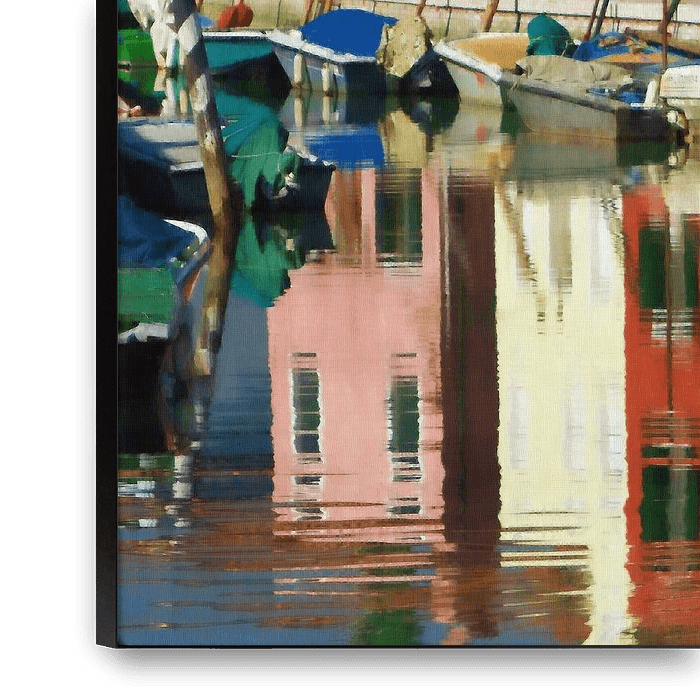 Die Spiegelung im Wasser bildet die bunten Häuser sehr schön ab. Die Bildbearbeitung wurde der Ölmalerei nachempfunden und unterstützt den malerischen Effekt.
