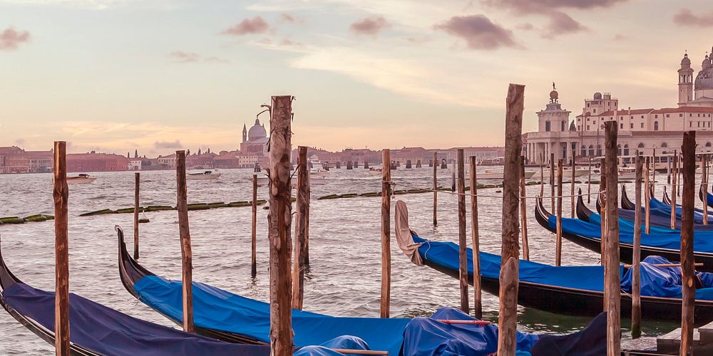 Inmitten einer Lagune wurde Venedig auf mehr als 100 Inseln erbaut. Diese Inseln sind durch über 400 Brücken miteinander verbunden, mehr als 150 Kanäle dienen als Straßen. Santa Maria della Salute ist eine barocke katholische Kirche an der Einfahrt zum Canal Grande. Eine schöne klassische Ansicht mit Blick Richtung Canal Grande und den typischen Gondeln.