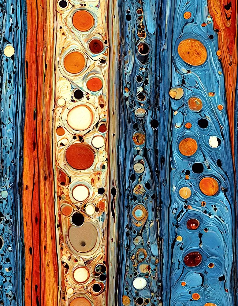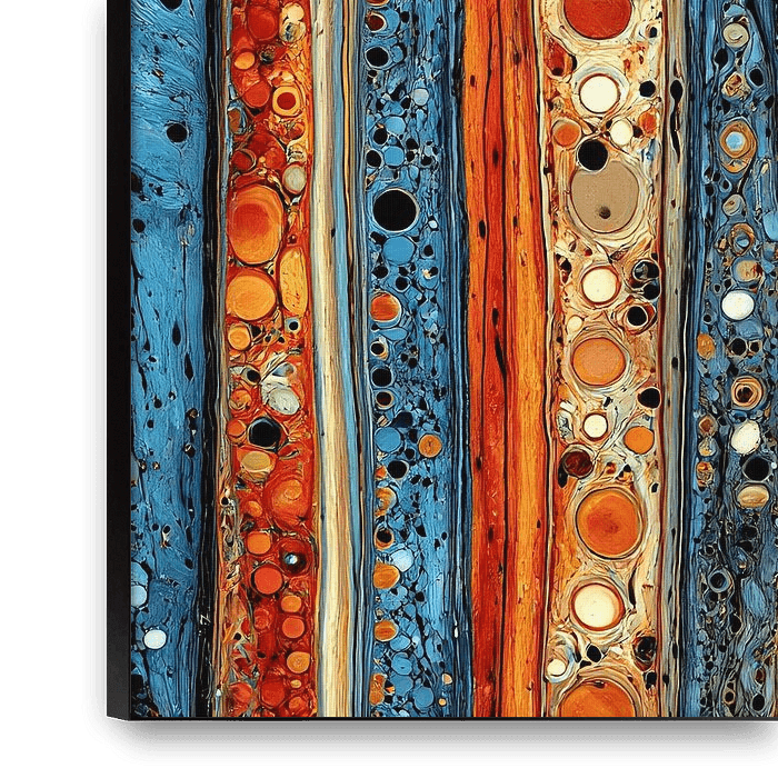 Dieses faszinierende abstrakte Kunstwerk "Vertical Strata" ist eine Ode an Farbe, Bewegung und organische Formen. Kräftige vertikale Bänder in tiefem Blau, leuchtendem Orange und cremefarbenen Neutraltönen sind mit verschlungenen kreisförmigen Motiven verwoben und schaffen ein faszinierendes Gefühl von Rhythmus und Tiefe. Die dynamische…