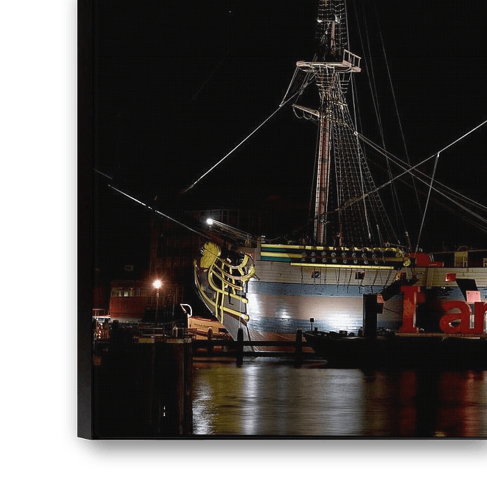 Abendansicht des Nationalen Schifffahrtsmuseums in Amsterdam mit dem daneben liegenden Nachbau des VOC-Schiffs "Amsterdam". Vor dem Schiff befindet sich ein Ponton mit der Aufschrift "I Amsterdam".