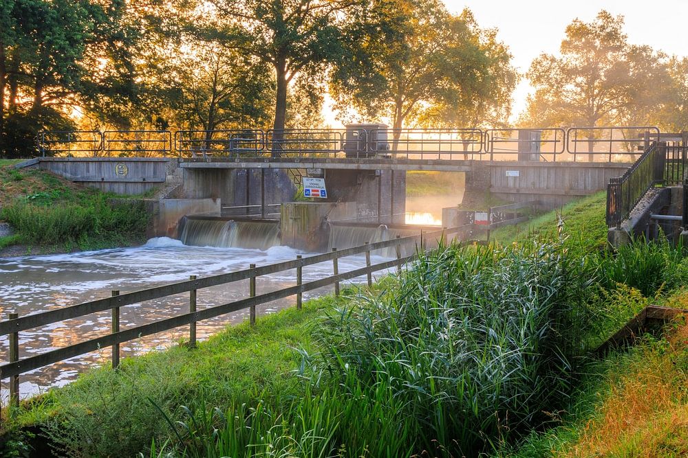 Der Valley Canal an einem schönen Frühlingsmorgen bei Sonnenaufgang. Es war herrlich ruhig. Nur der Gesang einiger Vögel war zu hören und natürlich das Wasser im Roffelaarskade-Wehr.