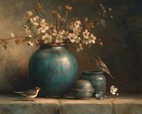 Vasen mit Blumen – Dieses Blumenbild ist ein Japandi-Stillleben, das eine große türkisfarbene Keramikvase voller zarter weißer Blüten und grüner Blätter vor einem warmen, dunklen Hintergrund zeigt, mit zwei kleinen Vögeln auf und neben den kleineren Vasen – ein stimmungsvolles Blumenbild, Blumen-Stillleben.